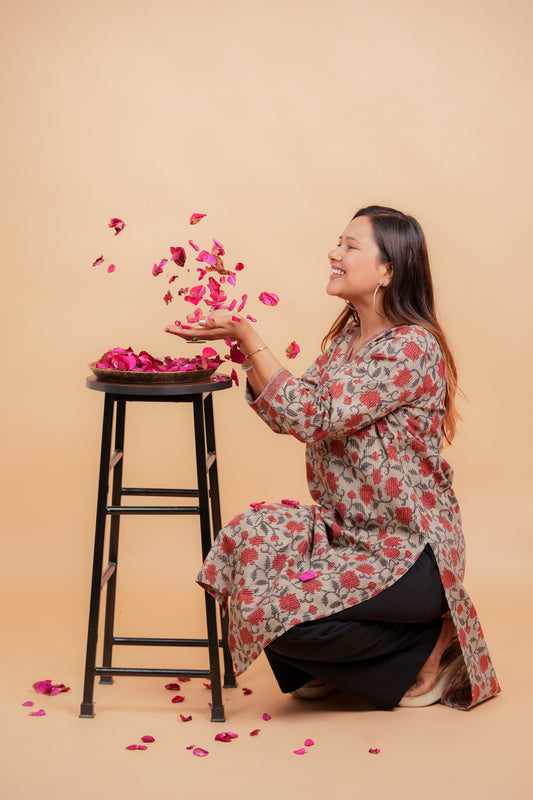 KAVANA- BEIGE AND BRICK RED COTTON KATHA KURTA