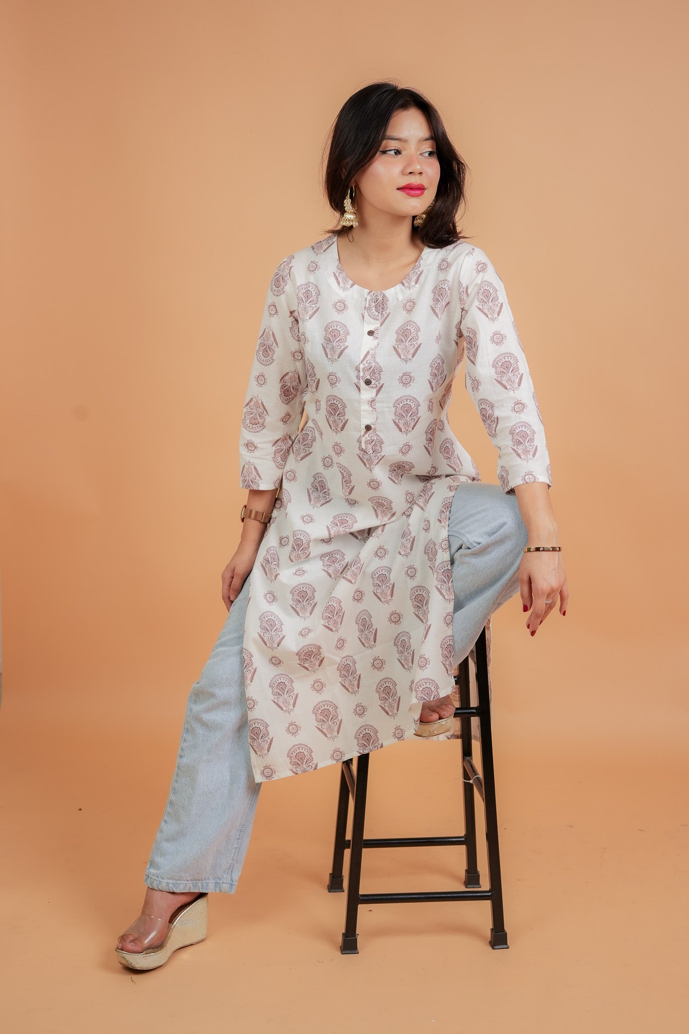 Elevate your wardrobe with the timeless elegance of our KARTHI Off White Cotton Kurta, featuring exquisite handcrafted prints. Made from premium-quality cotton, this kurta is designed for all-day comfort while exuding effortless charm.