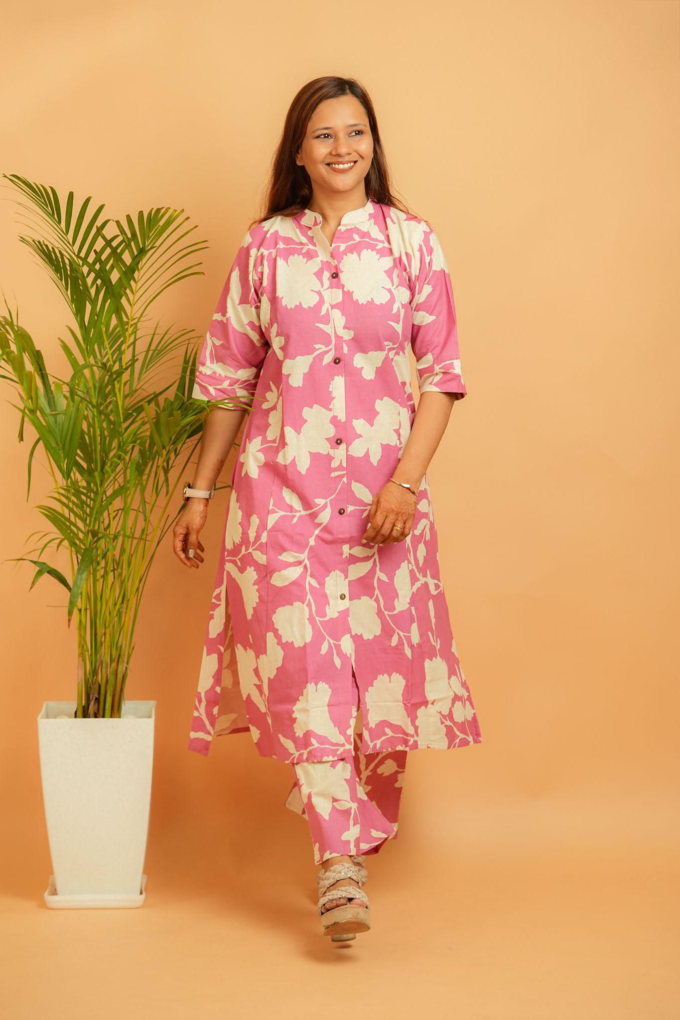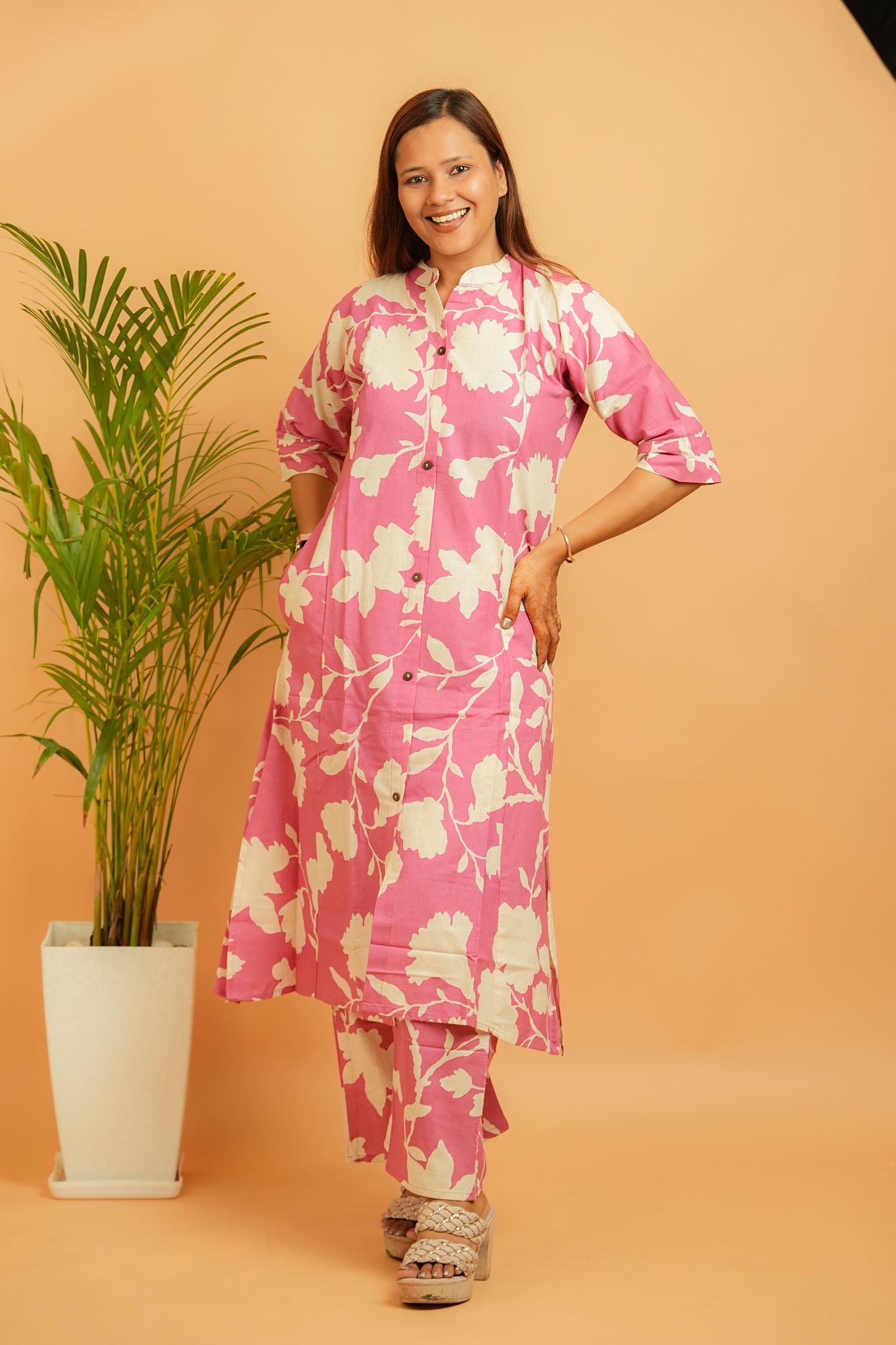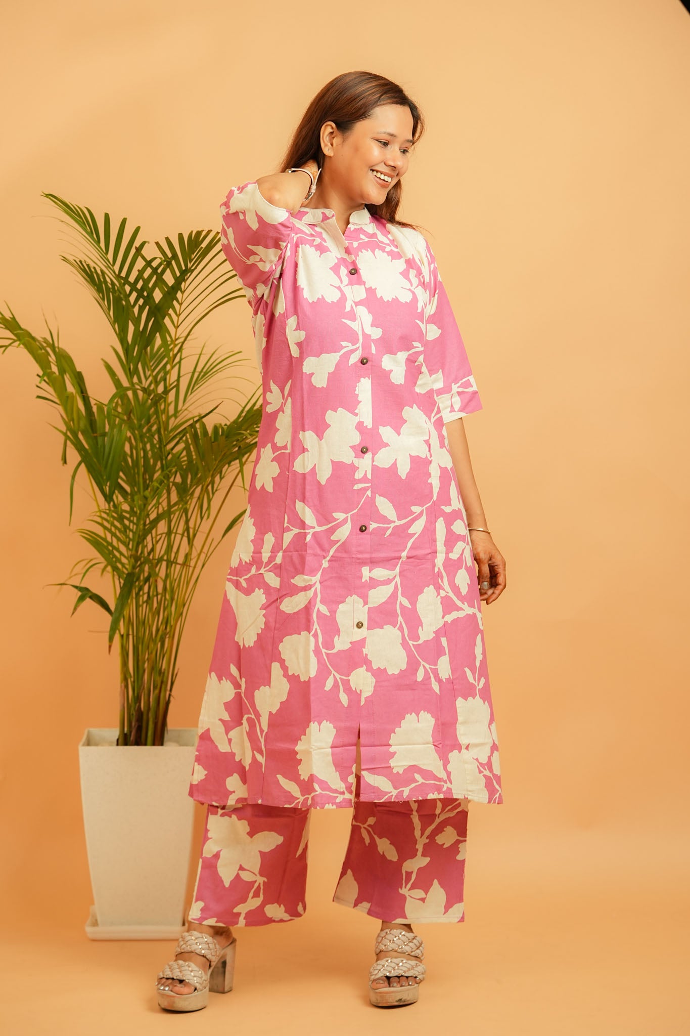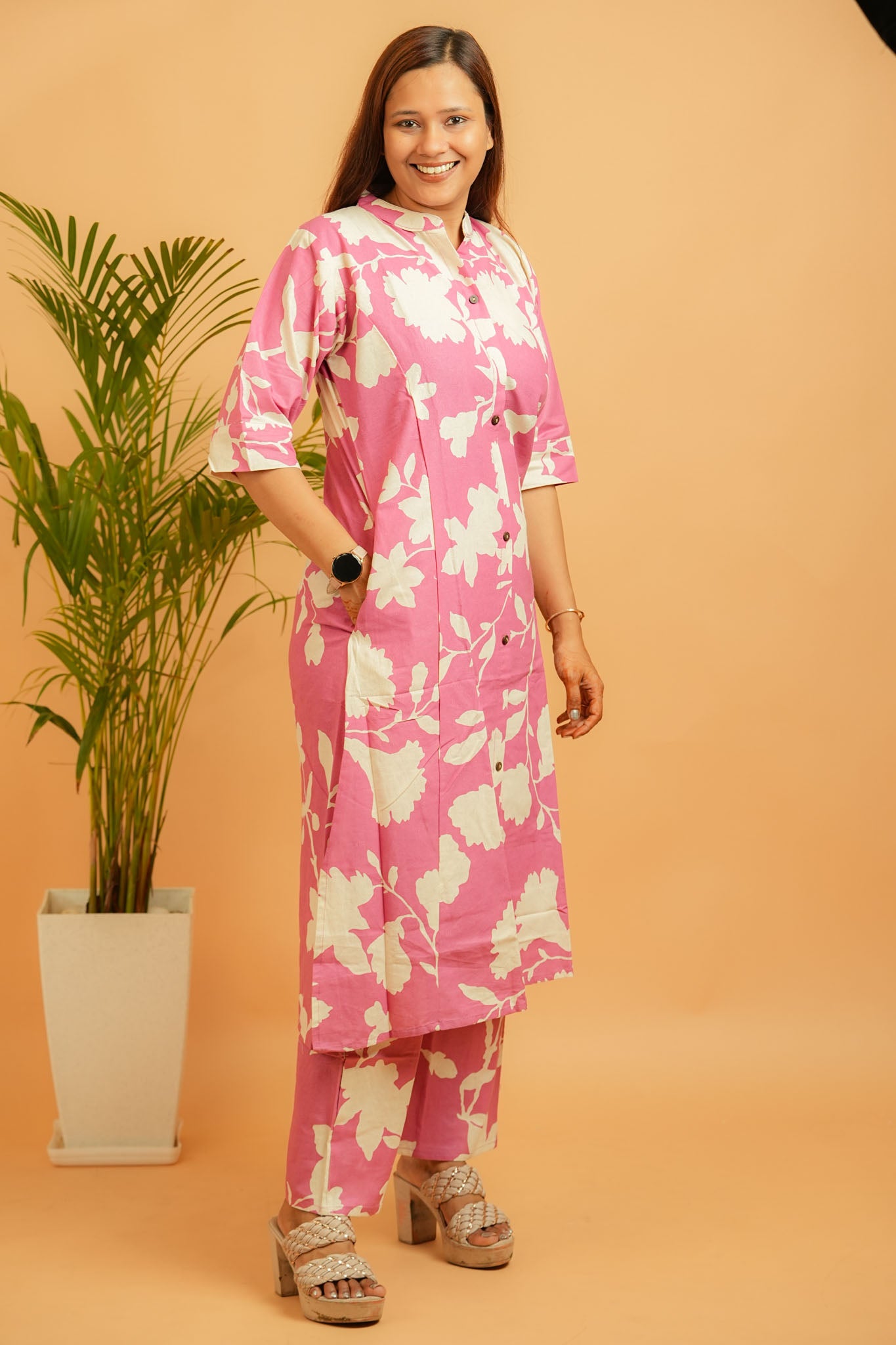 Lana features a warm purple co-ord set with white floral print, crafted in breathable cotton flex. With a regular fit, mandarin collar, and 3/4th sleeves, it’s designed for both style and ease. Perfect for brunches, slow Sundays, or casual errands.
