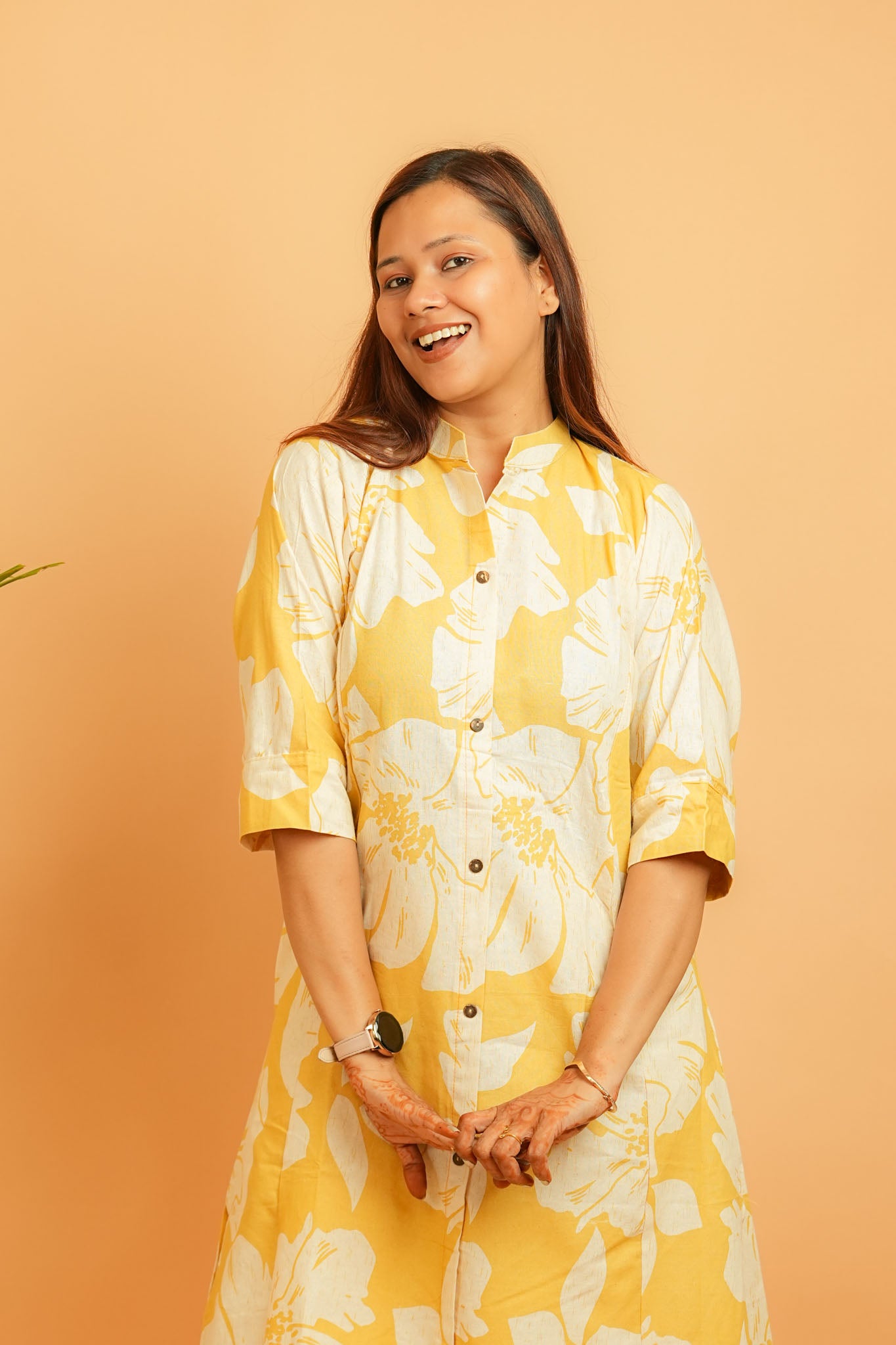 Lija features a warm yellow co-ord set with white floral print, crafted in breathable cotton flex. With a regular fit, mandarin collar, and 3/4th sleeves, it’s designed for both style and ease. Perfect for brunches, slow Sundays, or casual errands.