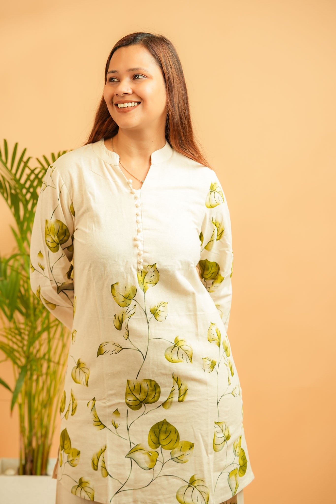 Lipi brings in botanical charm with green leafy details on a breathable natural canvas. Crafted from cotton flex, it’s tailored in a regular fit with a clean mandarin neckline. Comfort meets functionality in this subtle yet statement piece.