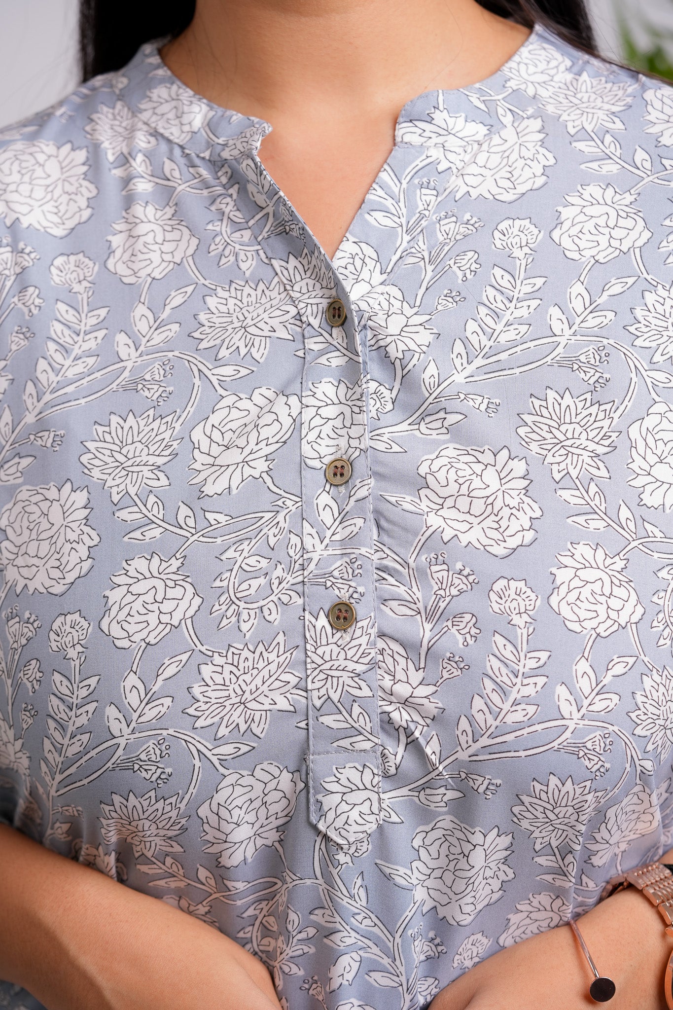 Crafted in soft rayon fabric, the Lochi set brings together elegance and ease. Featuring a mandarin neck, curved hemline, and delicate botanical prints with floral motifs, it’s perfect for elevating your everyday style.