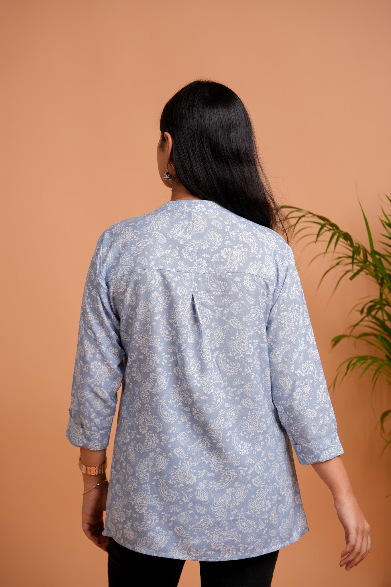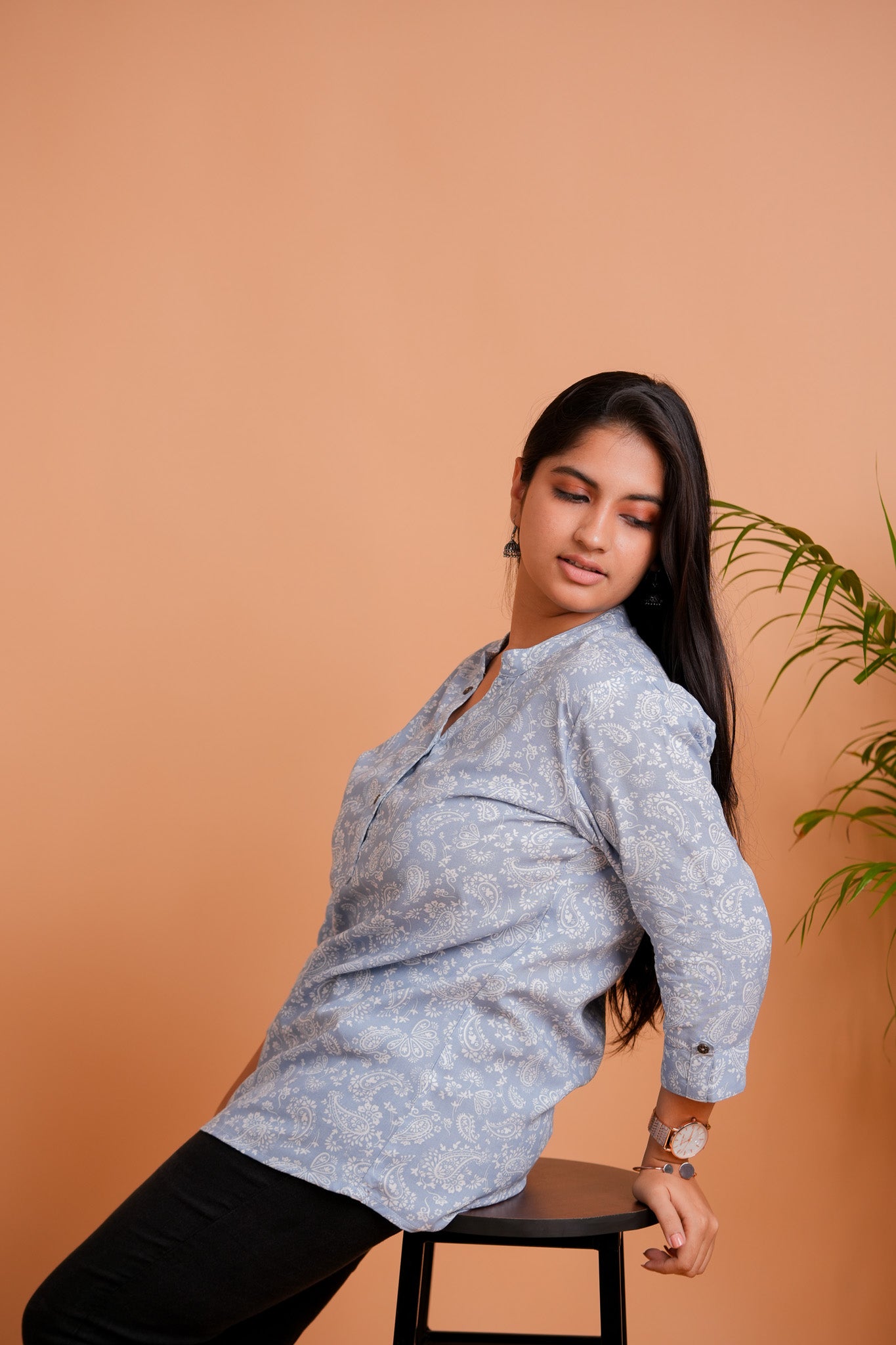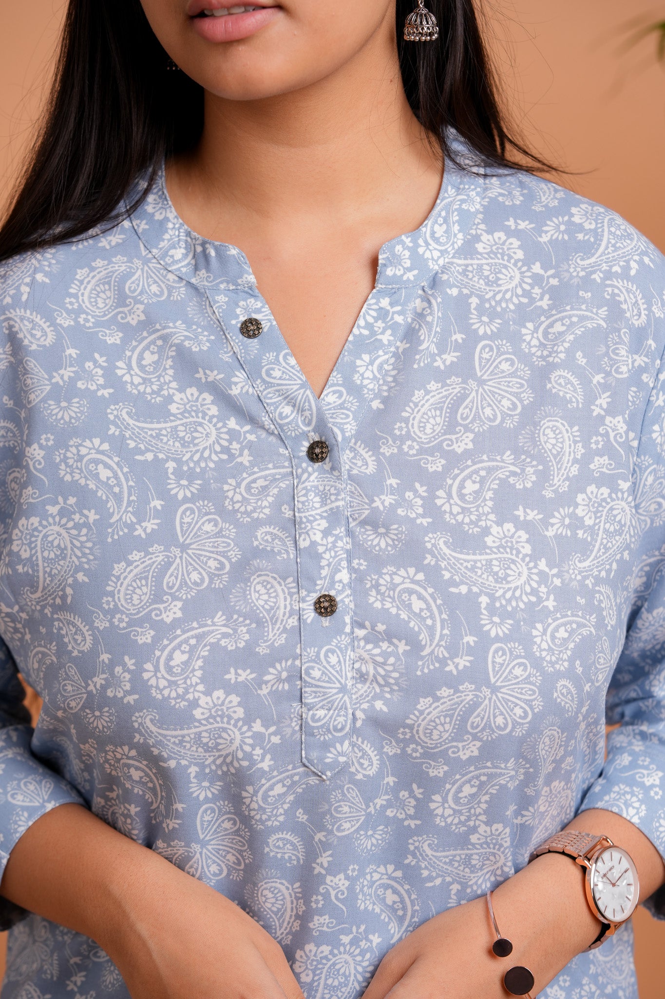Chic and calming, Pavitra features a powder blue base with graceful white botanical prints. Its lightweight rayon fabric and mandarin neck detail make it a cool, elegant option for warm days.