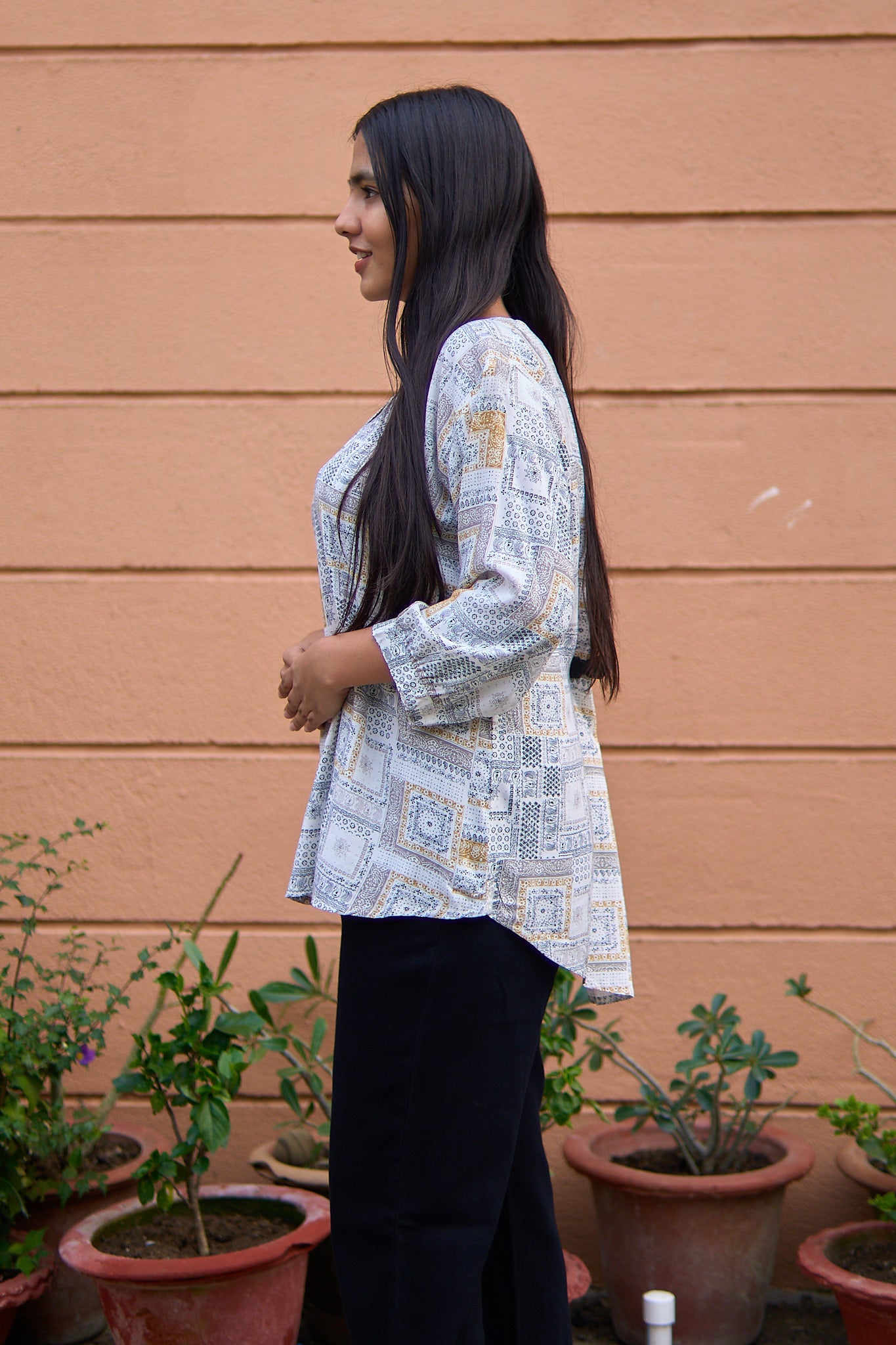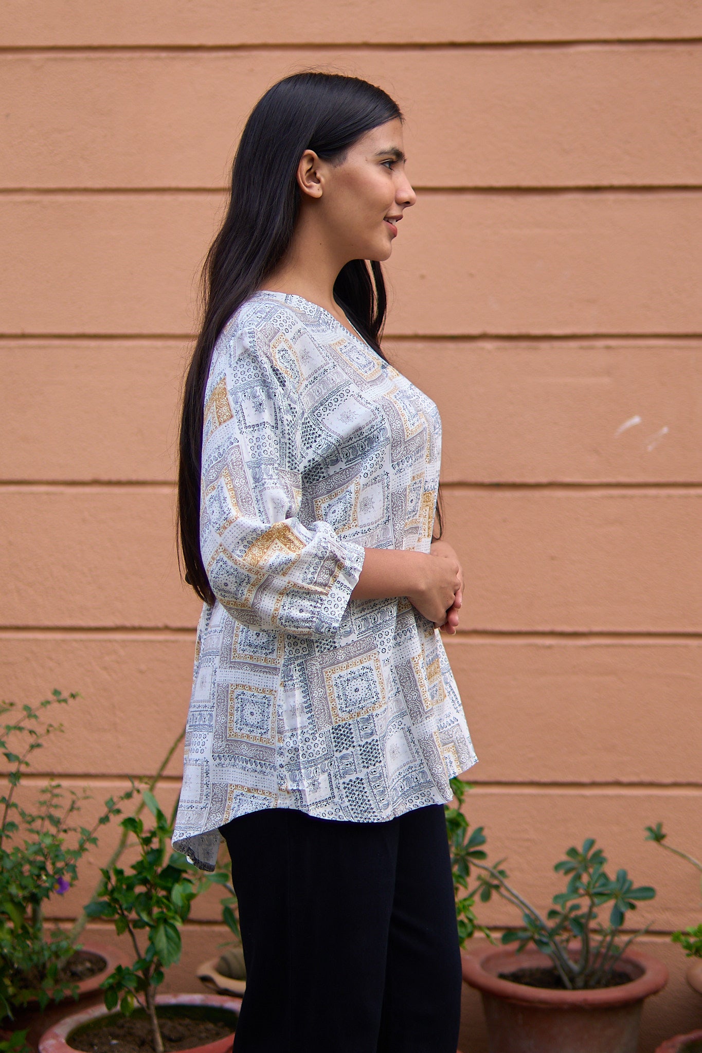 Elevate your wardrobe with the timeless elegance of our white printed tunic. Crafted from soft breathable rayon fabric. The smooth fluid drape of the fabric creates a flattering silhouette, making it ideal for both casual and dressier occasion. Featuring it with a v neck collar, this tunic can be easily paired with cotton pants, jeans and palazzos.
