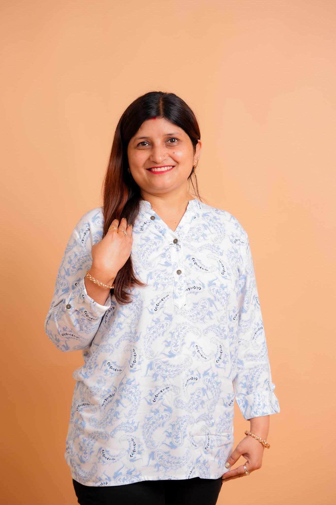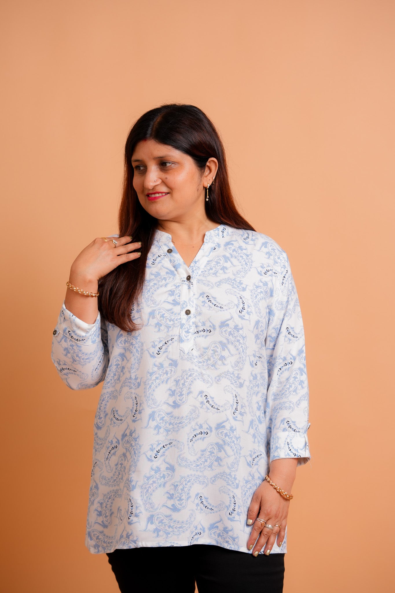 Embrace timeless charm with Prakhya, a soothing blend of white and blue crafted in soft, breathable rayon fabric. Featuring a stylish mandarin collar and feather-light feel, it's perfect for staying cool and chic through the summer.